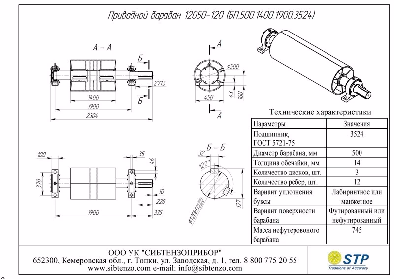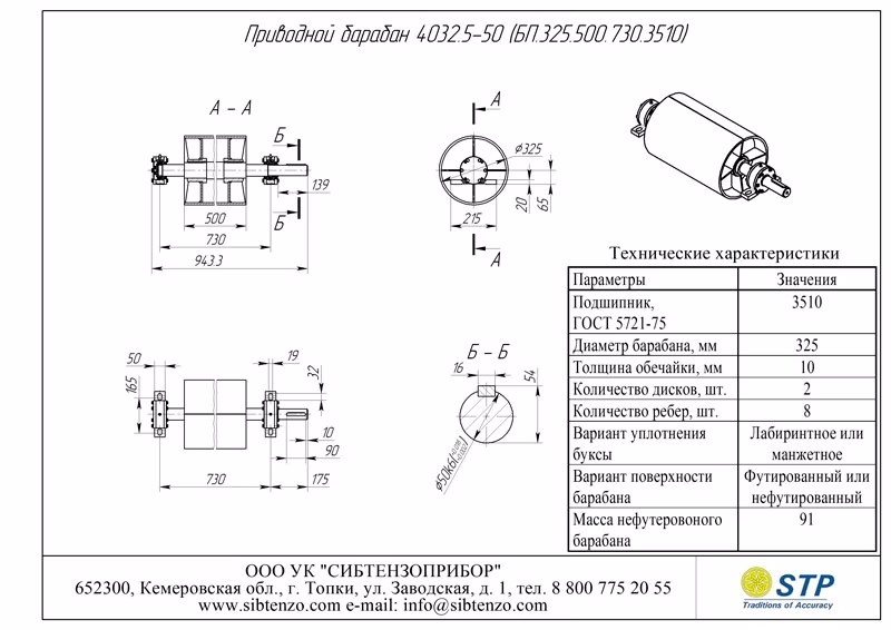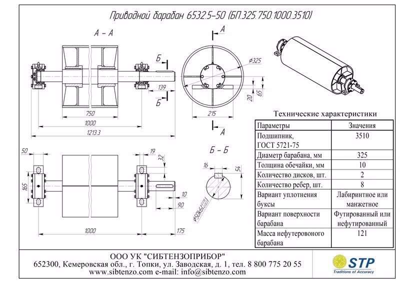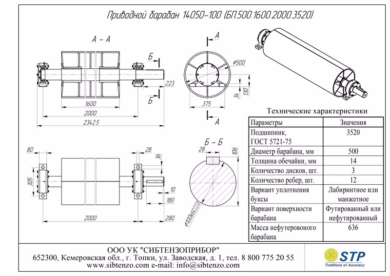 Пример условного обозначения приводного гладкого барабана Ø500 мм, для конвейера шириной ленты В=1000 мм и внутренним диаметром подшипника Ø80: Барабан приводной 10050-80. То же для футерованного барабана: Барабан приводной 10050Ф-80.